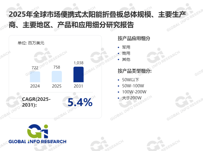 环洋市场咨询(Global Info Research)最新发布的《2026年全球市场便携式太阳能折叠板总体规模、主要企业、主要地区、产品和应用细分研究报告》,对全球便携式太阳能折叠板行业进行了系统性的全面分析。报告涵盖了全球 便携式太阳能折叠板 总体市场规模、关键区域市场态势、主要生产商的经营表现与竞争份额、产品细分类型以及下游应用领域规模,不仅深入剖析了全球范围内 便携式太阳能折叠板 主要企业的竞争格局、营业收入与市场份额,还重点解读了各厂商(品牌)的产品特点、技术规格、毛利率情况及最新发展动态。报告基准历史数据覆盖2021至2025年,并针对2026至2032年未来市场趋势作出权威预测,为行业参与者提供具备参考价值的洞察与决策依据。