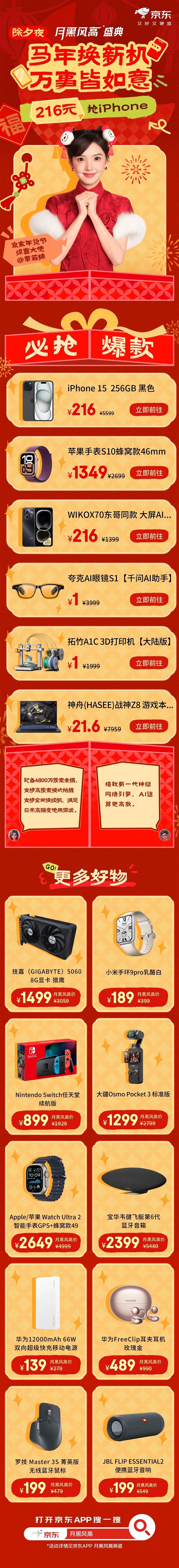 原价5599元的iPhone15256GB版本,活动价低至216元;原价3059元的技嘉50608GB显卡仅需1499元。此外,东哥同款的WIKOX70手机原价1399元,抢购价216元;原价7959元的神舟战神Z8游戏本更是低至21.6元。